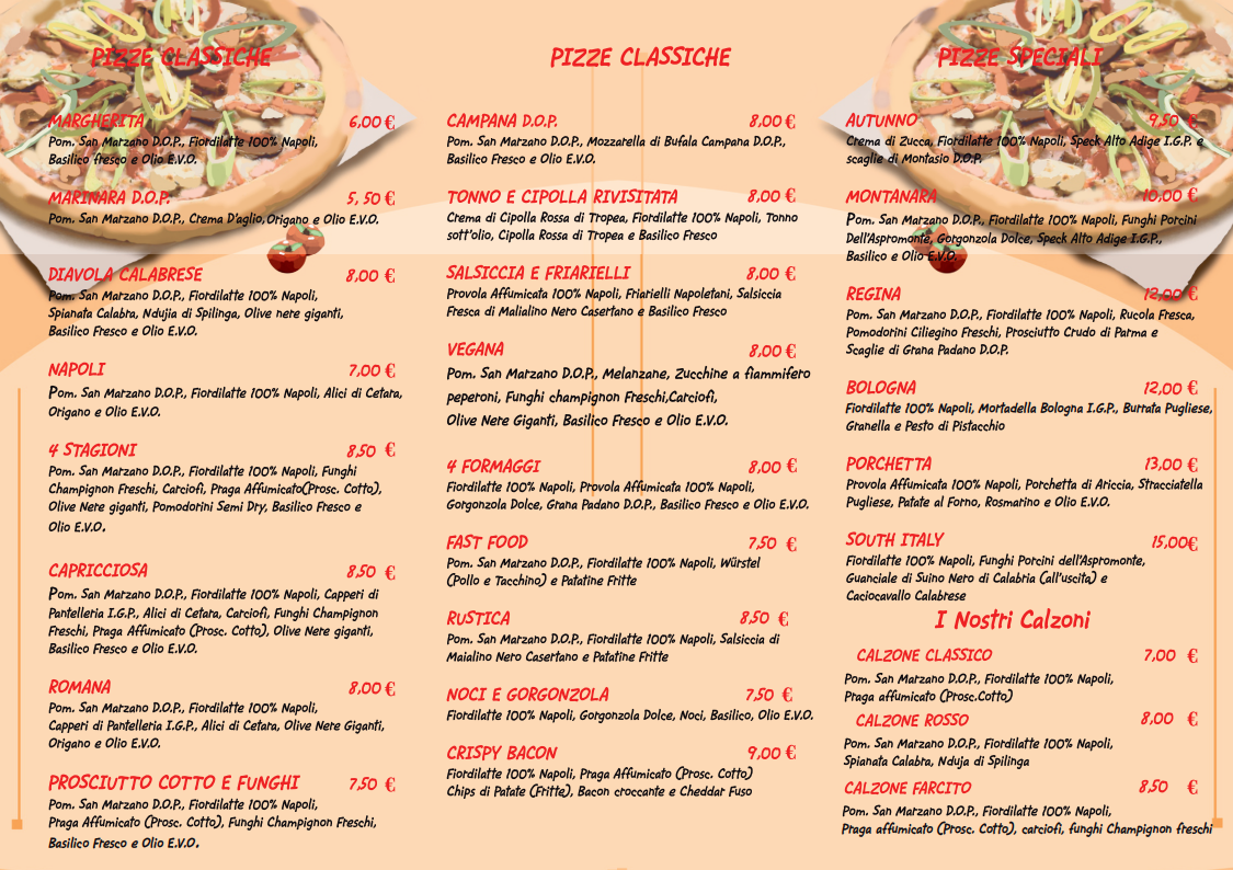 Presso la nostra pizzeria, offriamo un ampio assortimento di pizze classiche in stile napoletano, preparate con ingredienti italiani Dop al 100%. La nostra variegata selezione di pizze comprende le classiche come la Margherita, la Marinara, la Diavola, la Napoli, la 4 Stagioni, la Capricciosa, con deliziosi ingredienti come prosciutto cotto e funghi, tonno e cipolla, salsiccia e friarielli, 4 Formaggi, la romana, la campana dop con pomodoro San Marzano e mozzarella di bufala dop, noci e gorgonzola, la vegana, la particolare crispy e bacon e molti altri gusti unici e deliziosi. Siamo orgogliosi di offrire un'autentica esperienza culinaria italiana con le nostre pizze, realizzate con cura e passione, per soddisfare i palati più esigenti.